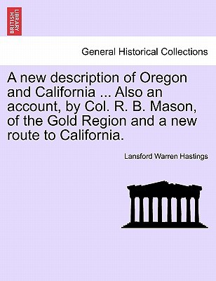 Title: A new description of Oregon and California ... Also an account, by Col. R. B. Mason, of the Gold Region and a new route to California.Publisher: British Library, Historical Print EditionsThe British Library is the national library of the United Kingdom. It is one of the world's largest research libraries holding over 150 million items in all known languages and formats: books, journals, newspapers, sound recordings, patents, maps, stamps, prints and much more. Its collections include around 14 million books, along with substantial additional collections of manuscripts and historical items dating back as far as 300 BC.The GENERAL HISTORICAL collection includes books from the British Library digitised by Microsoft. This varied collection includes material that gives readers a 19th century view of the world. Topics include health, education, economics, agriculture, environment, technology, culture, politics, labour and industry, mining, penal policy, and social order. ++++The below data was compiled from various identification fields in the bibliographic record of this title. This data is provided as an additional tool in helping to insure edition identification: ++++ British Library Hastings, Lansford Warren; 1849]. 8 . 10408.ee.7.(1.)