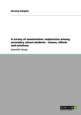 Scientific Study from the year 2010 in the subject Pedagogy - Job Education, Further Education, grade: 1.0, Bowen University, language: English, abstract: This research was carried out to investigate examination malpractice among secondary school students in Mushin Local Government area in Lagos State. The project highlights the causes of examination malpractice among secondary school students, the effect of examination malpractice and solution to examination malpractice in secondary schools. In this research work, a sample of twenty (20) teachers and one hundred (100) students were collected by means of simple random sampling techniques from five secondary schools in Mushin Local Government. The research instrument used for the study was the teacher's and student's perception questionnaire which was validated by the supervisor and used for the collection of data from the respondents. The data collected from respondents were analyzed with distribution tables and simple percentage. At the end of the analysis the study revealed the major reasons for examination malpractice which include parental pressure for good grades, value attached to certificate and so on. The study further recommend that parent should not put pressure on their children for good grades. Also emphasis should not be lay on certificates.