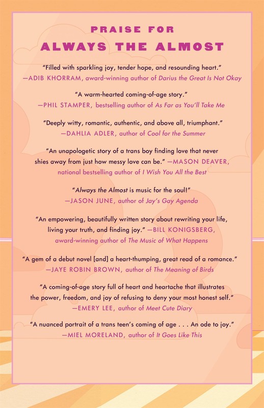 Sixteen-year-old trans boy Miles Jacobson has two New Year's resolutions: 1) win back his ex-boyfriend (and star of the football team) Shane McIntyre, and 2) finally beat his slimy arch-nemesis at the Midwest's biggest classical piano competition. But that's not going to be so easy. For one thing, Shane broke up with Miles two weeks after Miles came out as trans, and now Shane's stubbornly ignoring him, even when they literally bump into each other. Plus, Miles' new, slightly terrifying piano teacher keeps telling him that he's playing like he "doesn't know who he is"--whatever that means. Then Miles meets the new boy in town, Eric Mendez, a proudly queer cartoonist from Seattle who asks his pronouns, cares about art as much as he does--and makes his stomach flutter. Not what he needs to be focusing on right now. But after Eric and Miles pretend to date so they can score an invite to a couples-only Valentine's party, the ruse turns real with a kiss, which is also definitely not in the plan. If only Miles could figure out why Eric likes him so much. After all, it's not like he's cool or confident or comfortable in his own skin. He's not even good enough at piano to get his fellow competitors to respect him, especially now, as Miles. Nothing's ever been as easy for him as for other people--other boys. He's only ever been almost enough. So why, when he's with Eric, does it feel like the only person he's ever really not been enough for...is himself?A trans pianist makes a New Year's resolution on a frozen Wisconsin night to win regionals and win back his ex, but a new boy complicates things in Edward Underhill's heartfelt debut YA rom-dram, Always the Almost.