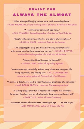A trans pianist makes a New Year's resolution on a frozen Wisconsin night to win regionals and win back his ex, but a new boy complicates things in Edward Underhill's heartfelt debut YA rom-dram, Always the Almost.
