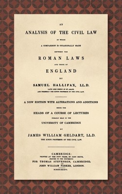 Reprint of the final and best edition. In 1774 Hallifax, Bishop of Gloucester, Regius Professor of Civil Law at Cambridge University and teacher of Sir Henry Maine, offered a course of lectures on "the Roman Civil Law." According to the Dictionary of National Biography, they were "attended by persons of the highest rank and fortune at the university." The lectures were published that year and reissued in 1775, 1779, 1795 and 1818. Geldart became Regius Professor in 1814. His contributions are interesting because they offer a snapshot of civil law studies at Cambridge a half-century later. v (iii-v new introduction), xxxv, 226, [1] pp.