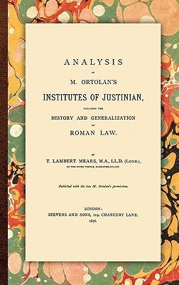A landmark in the study of Roman law Reprint of the only edition. The final edition of Ortolan's Explication Historique des Instituts de Justinien (1873) is a vast three-volume work containing a history of Roman law, a treatise on Roman jurisprudence and a complete commentary on the Institutes, the textbook of Justinian's law from the Corpus Juris Civilis. It was the standard textbook in its day and often the basis for examinations. Conceived for students with limited time and fluency in French, Mears's Analysis is a skillful condensation of Ortolan's work. Still a remarkably comprehensive study, it provides an excellent contextual overview of Roman law. CONTENTS PART I. History of Roman Legislation First Epoch -The Kings Second Epoch -The Republic Third Epoch -The Emperors Roman Law after Justinian PART II. Generalisation of Roman Law Introduction Persons Things Facts, Events, or Acts Rights PART III. Commentary on Justinian's Institutes Argument and Preface Book I Book II Book III Book IV T[homas]. Lambert Mears [1839-1918] was a barrister of the Inner Temple and taught at the University of London.