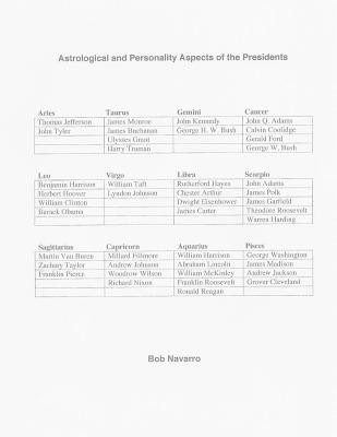 The set of 12 Zodiac signs and their significance under the tenets of Astrology form a set of perspectives for looking at the Presidents of the United States. The set of 16 distinct personality types as described by the Myers-Briggs psychological categories form another perspective from which to view the Presidents. Both of these sets are included in this book.