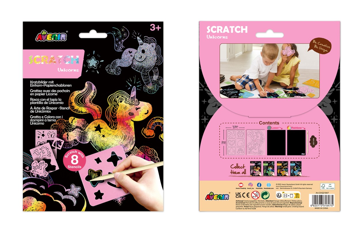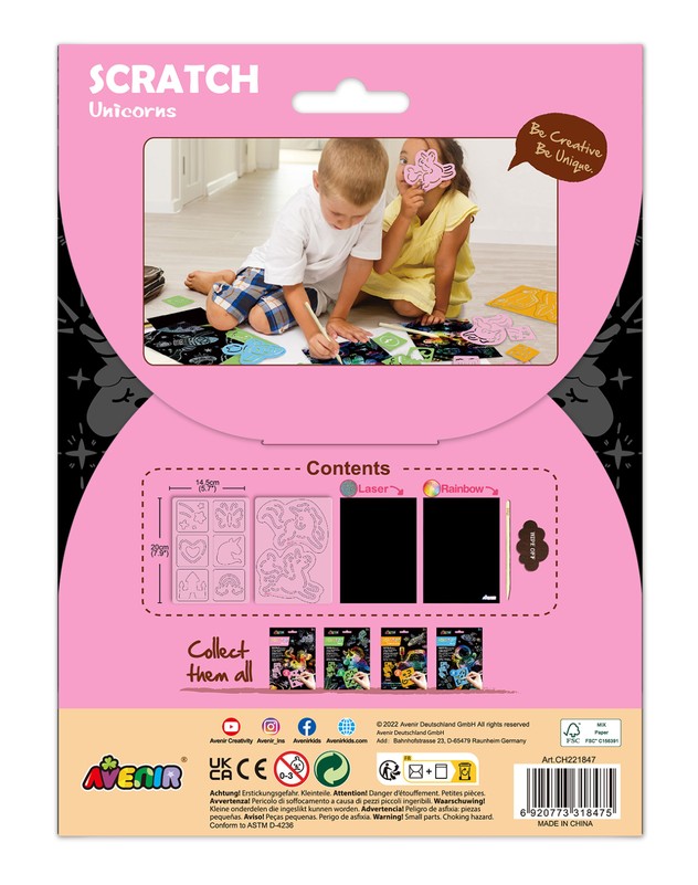 AVENIR skrāpējumu komplekts ļaus jūsu bērnam justies kā īstam māksliniekam! Katrs zīmuļa triepiens noņem melno krāsas slāni un atklāj krāsainu attēlu. Ieteicamais vecums: 3+. Šī komplekta īpašā iezīme ir unikālā apgleznošanas tehnika, kas tiek veidota, skrāpējot kontūru uz aptumšota fona.