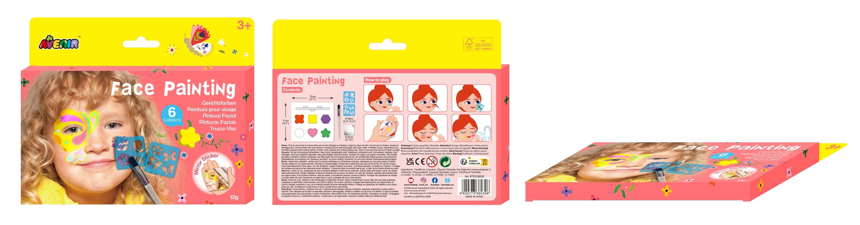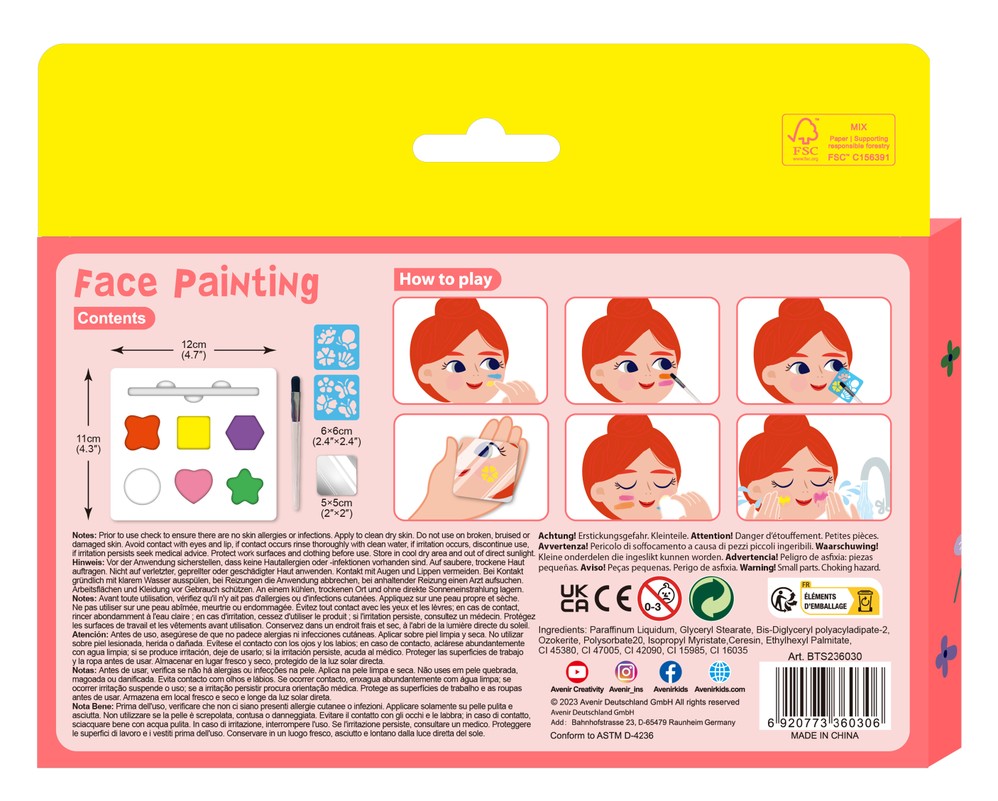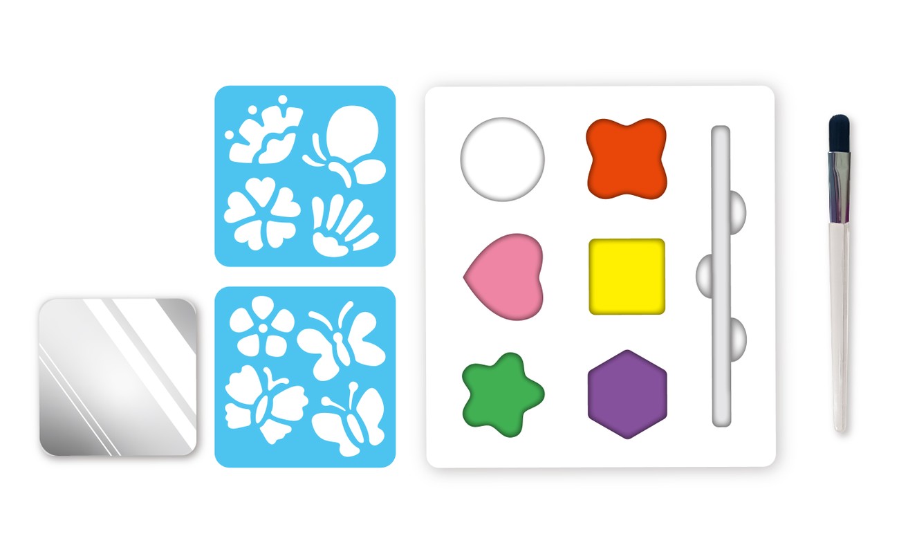 Sejas apgleznošana ir lielisks veids, kā bērni var radīt jautrus un svinīgus tēlus! Šajā viegli lietojamajā komplektā ir 6 sejas krāsas, 2 atkārtoti lietojami trafareti, otiņa,nodrošinot bērniem visu nepieciešamo, lai izpaustu radošumu.
