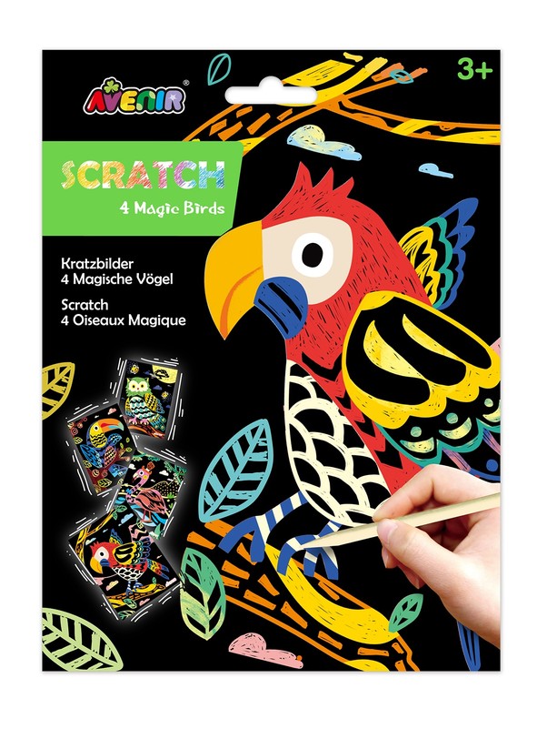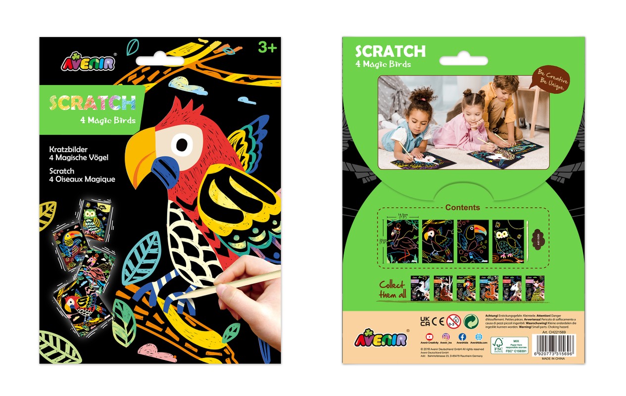 Nokasāmais komplekts: 4 maģiski putni. AVENIR skrāpējumu komplekts ļaus jūsu bērnam justies kā īstam māksliniekam! Katrs zīmuļa triepiens noņem melno krāsas slāni un atklāj krāsainu attēlu. Ieteicamais vecums: 3+. Šī komplekta īpašā iezīme ir unikālā apgleznošanas tehnika, kas tiek veidota, skrāpējot kontūru uz aptumšota fona. Komplektā: 4 nokasāmi attēli, audums noslaucīšanai, koka pildspalva.