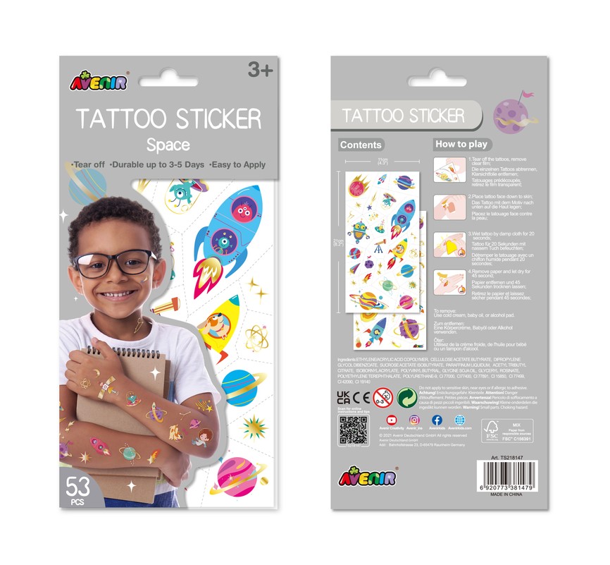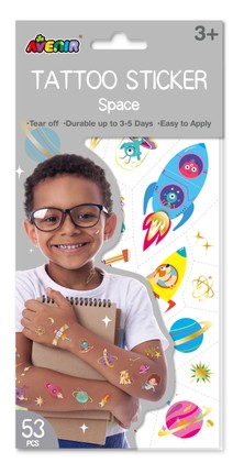 Tetovējumu uzlīmes: Kosmoss. 1) Atdaliet tetovējumu pa perforēto līniju, noņemiet caurspīdīgo plēvi. 2) Novietojiet tetovējumu uz ādas ar attēlu uz leju. 3) Samitriniet tetovējumu ar mitru drānu 20 sekundes. 4) Noņemiet papīru un ļaujiet nožūt 45 sekundes.