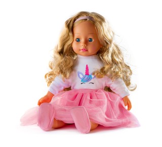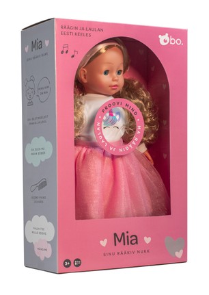 Welcome to the cute world of bo. friends, where cheerful talks and creative plays never end! Look at the Mia talking doll - your new adorable friend soon to be! She has long brushable blond hair for lot´s of hairstyles to create and beautiful sleeping blue eyes. She is dressed with a stylish pink skirt, white shirt with purple unicorn print, little cute pink shoes and look, what a beautiful headband on her curly hair! Doll talks in estonian language over 20+ phrases and will sing you a song as well. Press her soft belly to hear her lovely talk! Brush and style her hair, cuddle her, play with her, talk to her - it´s all about Mia doll, your new talking friend! Mia talking doll is 40cm tall.