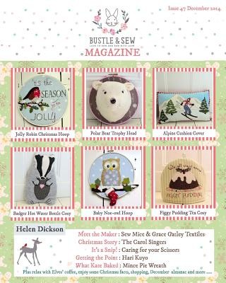 Inside you'll discover a collection of six new Bustle & Sew projects as well as features, articles, a round of of online goodies, baking - and even a poetry corner. It's so much more than just a sewing magazine, we believe it's a Jolly Good Read too! The Bustle & Sew Magazine is the work of just two women - Helen Dickson, the founder of and creative force behind the Bustle & Sew bunny and her daughter Rosie who's recently joined the team! So if you're expecting a glossy high-street publication, stuffed with adverts and promotions, then this probably isn't the magazine for you. But if you enjoy quirky, unusual and fun sewing projects, all with Helen's unique style, and enjoy filling your home with beautiful ideas, then you're sure to love the Bustle & Sew Magazine. This month is our bumper Christmas issue, with features including "Meet the Maker", Christmas story, Baking Corner and lots of Lovely Ideas as well as much more to enjoy. Projects this month include our Polar Bear Trophy Head - not just for Christmas, but year round too, as well as Jolly Robin Christmas Hoop, Alpine Skier Cushion, Badger Hot Water Bottle Cosy and more. There are images of all the projects on the front of the cover so you can see at a glance what's inside. Remember - the Bustle & Sew Magazine is an independent stitching and home magazine that carries no advertising at all - every page is full of content for you to enjoy. It's also available as an eMagazine over on the Bustle & Sew website - where you'll find lots more stitchy goodness to enjoy. You can keep up to date with all the goings on in Devon where Helen lives with her two Newfoundland Dogs, Daisy and Ben - there's never a dull moment! Visit www.bustleandsew.com to learn more. Merry Christmas everyone!