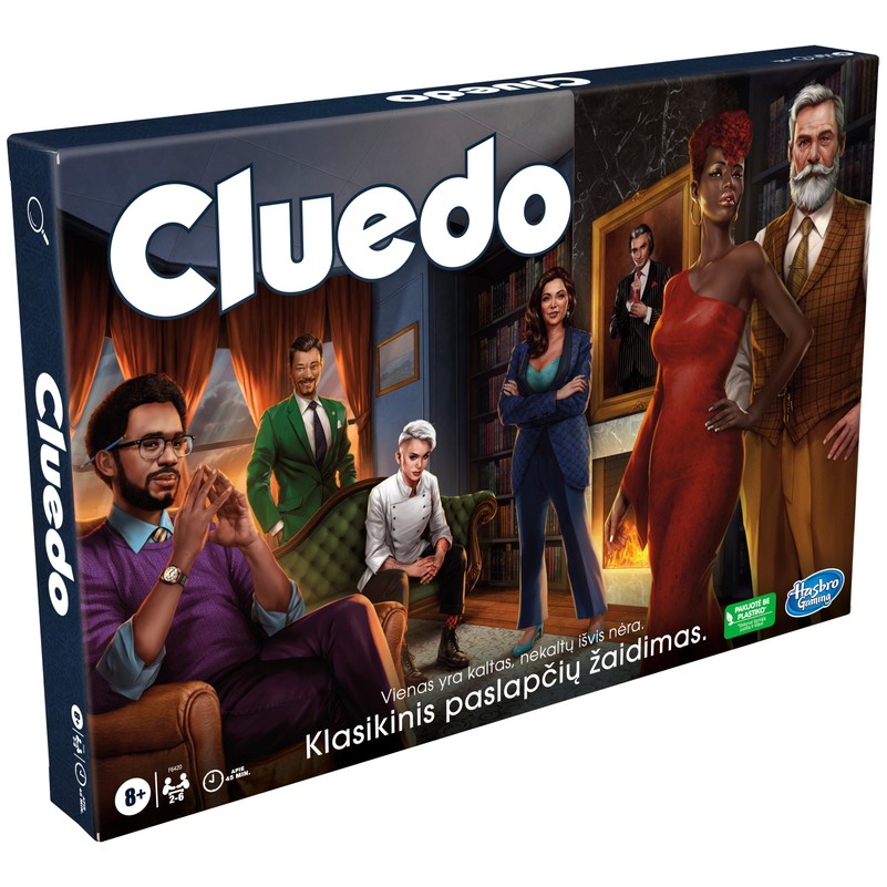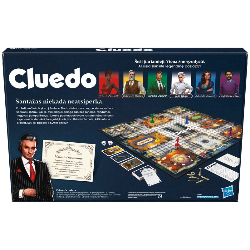 Who killed Boddy Black? Solve the mystery in this suspenseful Clue board game! When 6 guests arrive at Boden Black’s mansion, none are certain what to expect. But when their host turns up dead after revealing a sinister blackmail scheme, the pressure is on. Race against the other players to crack the case by gathering clues and narrowing down choices. Each player tracks their clues in a detective notepad and eliminates information to sleuth out who killed Mr. Black, where in the mansion they did it, and what weapon was used. Roll a magnifying glass icon? Draw a Clue card to add to the intrigue! A player might open a new secret passage or get to name a weapon they want revealed. Be the first to make the correct accusation and win the game! This Clue murder mystery game is beautifully reimagined with a dazzling cast of characters, luxurious setting, and fresh storyline. The game is in Lithuanian language.