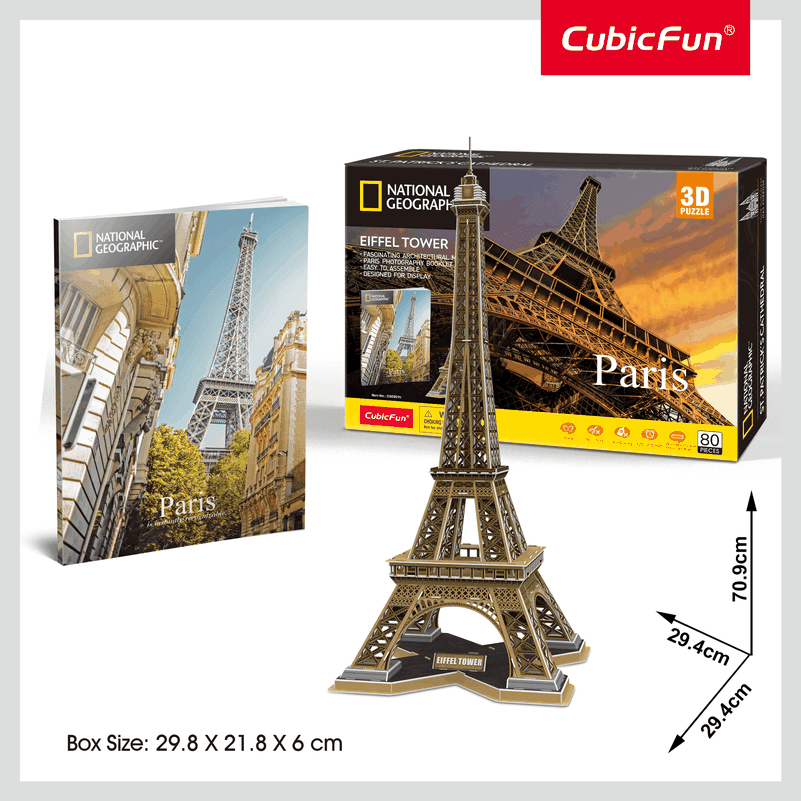 CubicFun 3D puzle "Eifeļa tornis". Modeļa komplekts ir izgatavots no papīra un EPS putuplasta, un tam ir pievienota viegli saprotama montāžas instrukcija. Visas detaļas ir precīzi savienojamas, nav nepieciešami instrumenti un līme. Pabeigtas puzles izmēri: 29,4 x 29,4 x 70,9 cm.