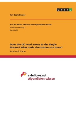 Academic Paper from the year 2016 in the subject Economics - International Economic Relations, grade: 18 (90%), Grenoble Ecole de Management, language: English, abstract: In 1973 the United Kingdom joined the European Union and the Single Market. Through this partnership, both economies grew and benefited from each other. However, recently politicians have questioned the United Kingdom's membership in the European Union and the Single Market, which led to political events such as the referendum for the Brexit. As the majority of the population decided to vote in favor of the Brexit, the necessity to analyze the dependency of the United Kingdom on the Single Market has increased. This report provides an analysis of that dependency with respect to different groups of stakeholders, including companies in the industrial and service sectors as well as communities. The analysis is followed by an identification and evaluation of the most plausible trade alternatives. The findings of the report state that the United Kingdom highly depends on access to the Single Market on the short-term perspective, might be able to reduce it on the long-term perspective, but will unlikely become completely independent from the access to the Single Market.