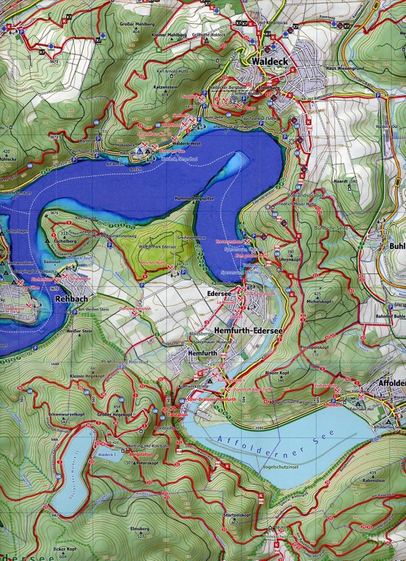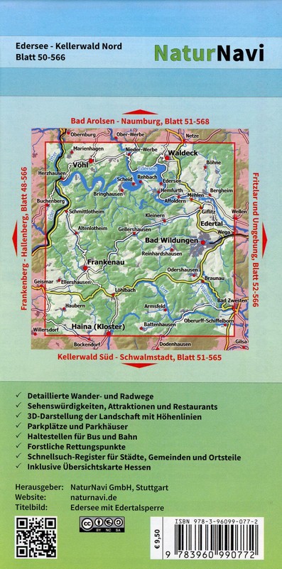 . Detaillierte Wander- und Radwege . Sehenswürdigkeiten, Attraktionen und Restaurants . 3D-Darstellung der Landschaft mit Höhenlinien . Parkplätze, Parkhäuser . Haltestellen für Bus und Bahn . Forstliche Rettungspunkte . Schnellsuch-Register für Städte, Gemeinden und Ortsteile . Inklusive Übersichtskarte Hessen