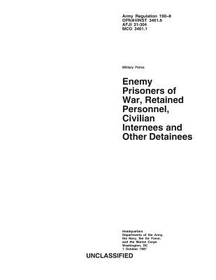 This regulation provides policy, procedures, and responsibilities for the administration, treatment, employment, and compensation of enemy prisoners of war (EPW), retained personnel (RP), civilian internees (CI) and other detainees (OD) in the custody of U.S. Armed Forces. This regulation also establishes procedures for transfer of custody from the United States to another detaining power. This regulation implements international law, both customary and codified, relating to EPW, RP, CI, and ODs which includes those persons held during military operations other than war. The principal treaties relevant to this regulation are: (1) The 1949 Geneva Convention Relative to the Amelioration of the Condition of the Wounded and Sick in Armed Forces in the Field (GWS). (2) The 1949 Geneva Convention for the Amelioration of the Condition of Wounded, Sick and Shipwrecked Members of Armed Forces at Sea (GWS SEA). (3) The 1949 Geneva Convention Relative to the Treatment of Prisoners of War (GPW). (4) The 1949 Geneva Convention Relative to the Protection of Civilian Persons in Time of War (GC), and In the event of conflicts or discrepancies between this regulation and the Geneva Conventions, the provisions of the Geneva Conventions take precedence.