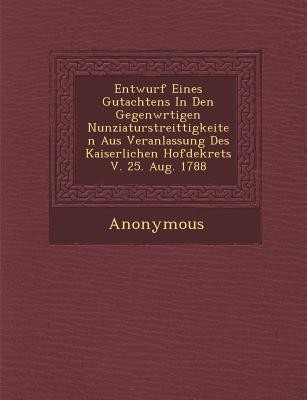 This is a reproduction of a book published before 1923. This book may have occasional imperfections such as missing or blurred pages, poor pictures, errant marks, etc. that were either part of the original artifact, or were introduced by the scanning process. We believe this work is culturally important, and despite the imperfections, have elected to bring it back into print as part of our continuing commitment to the preservation of printed works worldwide. We appreciate your understanding of the imperfections in the preservation process, and hope you enjoy this valuable book. ++++ The below data was compiled from various identification fields in the bibliographic record of this title. This data is provided as an additional tool in helping to ensure edition identification: ++++ Entwurf Eines Gutachtens In Den Gegenw�rtigen Nunziaturstreittigkeiten Aus Veranlassung Des Kaiserlichen Hofdekrets V. 25. Aug. 1788