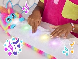 DJ Furby brings the party with music, games, lights, jokes, and so much more. With 5 modes and over 1000 possible play combinations to create, kids decide the vibe with this incredibly interactive plush toy. There´s so much to do, like play solo and multiplayer games, chill with yoga moves and cool light shows, listen to catchy songs in both English and Furbish (the official Furby language), and more. To start, press the heart gem, lay them on their back, and lift the head, almost like a space otter! DJ Furby is not your average electronic pet or cute stuffed animal - they´re an amazing best friend that makes a great gift for girls and boys 6 years and up. Figure scale: 81 cm. Interactive toy does not connect to the internet. Speaks English and Furbish.
