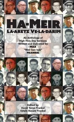 Ha-Meir La-Aretz Ve-la-Darim is a two sided book with an anthology of High Holy Day sermons written and delivered by Max "Meir ben Isak" Frankel on one side and and a mouth-watering collection of "Torat Imekha," Purim recipes from the kitchen of Gloria "Golda bas Shmuel Hayim HaLevi" Frankel on the other.