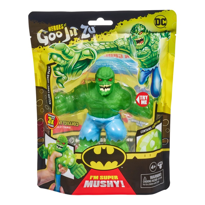 DC supervaroņi un Heroes of Goo Jit Zu atkal ir apvienojuši spēkus, lai piedāvātu jums visu laiku staipīgāko, gļotaināko un vspatīkamāk spaidāmo supervaroņu klāstu — visi ir gatavi uzveikt ļaunumu un izglābt pasauli! Katram DC varonim ir unikāls pildījums ar atšķirīgu tekstūru un sajūtu uz tausti. Tagad vairākiem jūsu iecienītākajiem DC supervaroņiem ir nebijušas Super Goo spējas. Rotaļājieties ar iecienītajām figūriņām jaunajā, GĻOTAINAJĀ versijā, kas NERADA nekārtību. Šīs lieliskās rotaļu figūriņas ir izcili izturīgas. Spaidiet, saspiediet un staipiet to rokas, kājas un ķermeņus! Viņu apbrīnojami elastīgie ķermeņi var izstiepties pat trīsreiz garāki par savu izmēru un pēc tam atgriezties sākotnējā formā un izmērā! Atklājiet jaunu rotaļāšanās veidu un izglābiet pasauli ar šīm lieliskajām, kolekcionējamajām DC Heroes of Goo Jit Zu figūriņām!