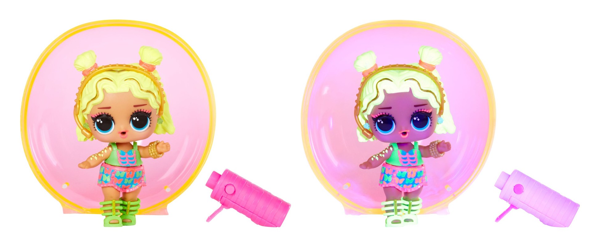 Piedāvājam L.O.L Surprise! Neona popzvaigznes! Atklājiet savu mūzikas mākslinieka iedvesmoto lellīti ar tematiskiem aksesuāriem un melno gaismu, kas atklāj papildu aizraujošas dekora detaļas! Visām lellītēm ir unikālas dekorācijas, kas parādās, kad uz lellītes un tās aksesuāriem tiek uzspīdināta komplektā iekļautā melnā gaisma.
