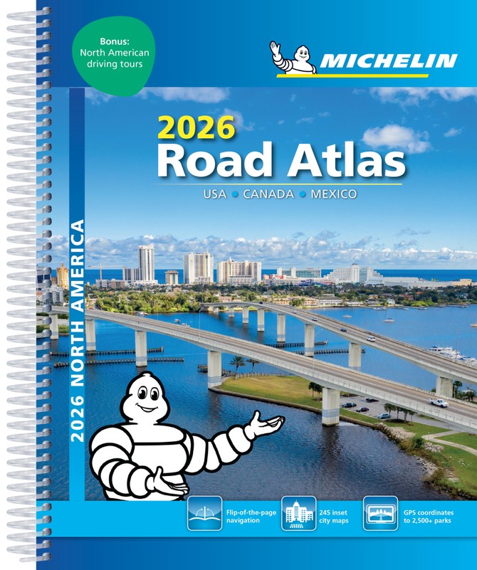 GPS companion atlas for North America offering unique tiled format designed for the way you drive. Michelin's deluxe atlas complements GPS navigation systems and online driving directions with mapping arranged geographically instead of state-by-state. A bonus locator index includes more than 2,000 national, state and provincial parks with GPS and map page coordinates, making it a snap to plan a trip to enjoy nature's beauty. Over 1,000 travel center locations are pinpointed, giving travelers peace of mind during their journey. The atlas's unique tiled format makes it simple to follow a route with a flip of the page, and its spiral binding offers lay-flat convenience. Covers USA, Canada and Mexico. Scale 1/625,000 ? 1/9,018,000.