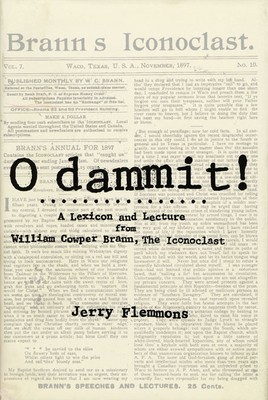 Why am I an Iconoclast? . . . Sir, I am a seeker of Truth. . . . [W]hen you get an idea, put it on the anvil and bid the world hit it with the heaviest sledge. The more you hammer Truth the brighter it becomes. When an enraged reader gunned him down in Waco, April Fool's Day 1898, William Cowper Brann had published The Iconoclast, the nation's most controversial magazine, for some forty months. It was the only American journal to claim a quarter-of-a-million monthly circulation, owing largely to Brann's gusto for offering up his truths. Though his circulation was international, his favorite idols for smashing were those he found at home in Waco, nicknamed Six-Shooter Depot and which exemplified, he believed, Texas's reputation for furnish[ing] forth more hidebound dogmatists, narrow-minded bigots and intolerable fanatics in proportion to population than any other section of these United States! Though a twelve-volume 1912 edition of The Iconoclast resides here and there in rare book collections, public access to the writings of Texas's perhaps most infamous and entertaining journalist has been surprisingly limited. Jerry Flemmons's lexicon synthesizes the most memorable and current Brannisms into a facilely retrievable format. From America to Texas Politics to the Universe, these selected snippets prove how brightly indeed wisdom, wit, and the well-turned phrase survive pounding of the ages. But perhaps the beacon of O dammit! is the one-man, two-act play that Flemmons presents as a lecture by Brann on the last day of his life. Though it has been performed around Texas for more than a decade, it is a script whose every stage note and direction deserves to be read and whose every line reflects not only Brann's genius but also that of the man who's become the keenest authority thereon.