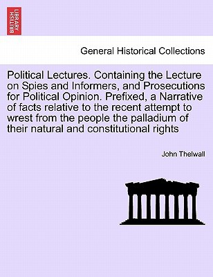 Title: Political Lectures. Volume the first, Part the first: containing the Lecture on Spies and Informers (fourth edition), and the first Lecture on Prosecutions for Political Opinion (third edition). To which is prefixed, a Narrative of facts relative to the recent attempt to wrest from the people the palladium of their natural and constitutional rights. Few MS. notes [by the Author].Publisher: British Library, Historical Print EditionsThe British Library is the national library of the United Kingdom. It is one of the world's largest research libraries holding over 150 million items in all known languages and formats: books, journals, newspapers, sound recordings, patents, maps, stamps, prints and much more. Its collections include around 14 million books, along with substantial additional collections of manuscripts and historical items dating back as far as 300 BC.The GENERAL HISTORICAL collection includes books from the British Library digitised by Microsoft. This varied collection includes material that gives readers a 19th century view of the world. Topics include health, education, economics, agriculture, environment, technology, culture, politics, labour and industry, mining, penal policy, and social order. ++++The below data was compiled from various identification fields in the bibliographic record of this title. This data is provided as an additional tool in helping to insure edition identification: ++++ British Library Thelwall, John; 1795. 8 . 12270.pp.4.(5.)