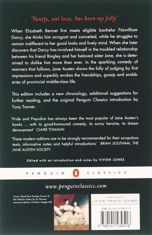 Few have failed to be charmed by the witty and independent spirit of Elizabeth Bennet in Austen's beloved classic Pride and Prejudice. When Elizabeth Bennet first meets eligible bachelor Fitzwilliam Darcy, she thinks him arrogant and conceited; he is indifferent to her good looks and lively mind. When she later discovers that Darcy has involved himself in the troubled relationship between his friend Bingley and her beloved sister Jane, she is determined to dislike him more than ever. In the sparkling comedy of manners that follows, Jane Austen shows us the folly of judging by first impressions and superbly evokes the friendships, gossip and snobberies of provincial middle-class life. This Penguin Classics edition, based on Austen's first edition, contains the original Penguin Classics introduction by Tony Tanner and an updated introduction and notes by Viven Jones.