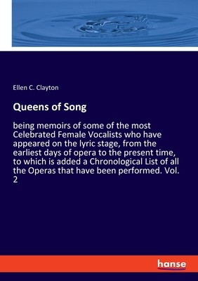 Queens of Song - being memoirs of some of the most Celebrated Female Vocalists who have appeared on the lyric stage, from the earliest days of opera to the present time, to which is added a Chronological List of all the Operas that have been performed. Vol. 2 is an unchanged, high-quality reprint of the original edition of 1863. Hansebooks is editor of the literature on different topic areas such as research and science, travel and expeditions, cooking and nutrition, medicine, and other genres. As a publisher we focus on the preservation of historical literature. Many works of historical writers and scientists are available today as antiques only. Hansebooks newly publishes these books and contributes to the preservation of literature which has become rare and historical knowledge for the future.