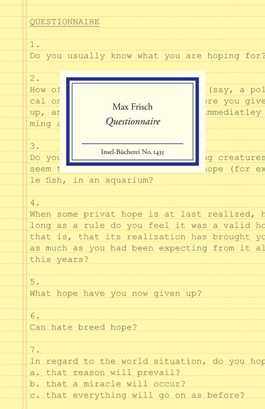"Halten Sie sich für einen guten Freund? Sind Sie sich selber ein Freund?" Zwischen diesen beiden Fragestellungen liegen 23 Fragen zum Thema Freundschaft. Die Antworten bleiben den Leserinnen und Lesern überlassen. Dieser und zehn weitere Fragebogen umkreisen die Themen Ehe, Frauen, Hoffnung, Humor, Geld, Vatersein, Heimat, Eigentum, Tod, Erhaltung des Menschengeschlechts.