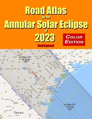 The Road Atlas for the Annular Solar Eclipse of 2023 contains a comprehensive series of 29 maps of the path of annularity across the USA, Mexico, Central and South America. The large scale (1 inch = 28 miles) shows both major and minor roads, towns and cities, rivers, lakes, parks, national forests, wilderness areas and mountain ranges.