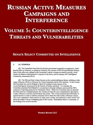 This fifth and final volume focuses on the counterintelligence threat, outlining a wide range of Russian efforts to influence the Trump Campaign and the 2016 election. In this volume the Committee lays out its findings in detail by looking at many aspects of the counterintelligence threat posed by the Russian influence operation. For example, the Committee examined Paul Manafort's connections to Russian influence actors and the FBI' s treatment of reporting produced by Christopher Steele. While the Committee does not describe the final result as a complete picture, this volume provides the most comprehensive description to date of Russia's activities and the threat they posed. This volume presents this information in topical sections in order to address coherently and in detail the wide variety of Russian actions. The events explained in these sections in many cases overlap, and references in each section will direct the reader to those overlapping parts of the volume.