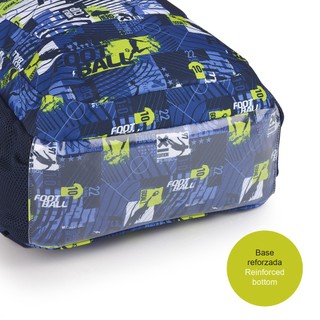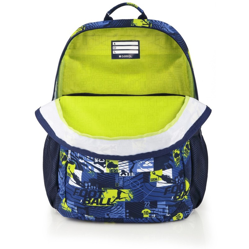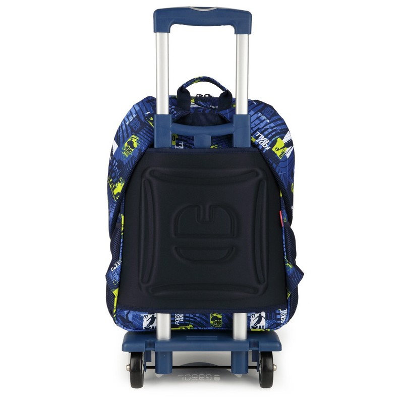 Skolas mugursoma ar riteņiem Divas nodaļas. sānu tīkla kabata izgatavotas no elastīga sieta. Priekšpusē kabata ar rāvējslēdzēju. Atstarojoši elementi. Stingrāka muguras daļa. Plašas, mīkstas plecu siksnas. Apakšā ir pārklāta ar aizsargplēvi. Izgatavots no materiāla, kas nesatur PVC. Izmēri: 32 x 44 x 18 cm Ražotājs: Gabol, Spānija.