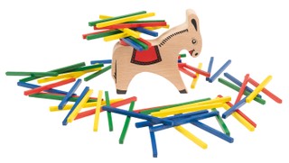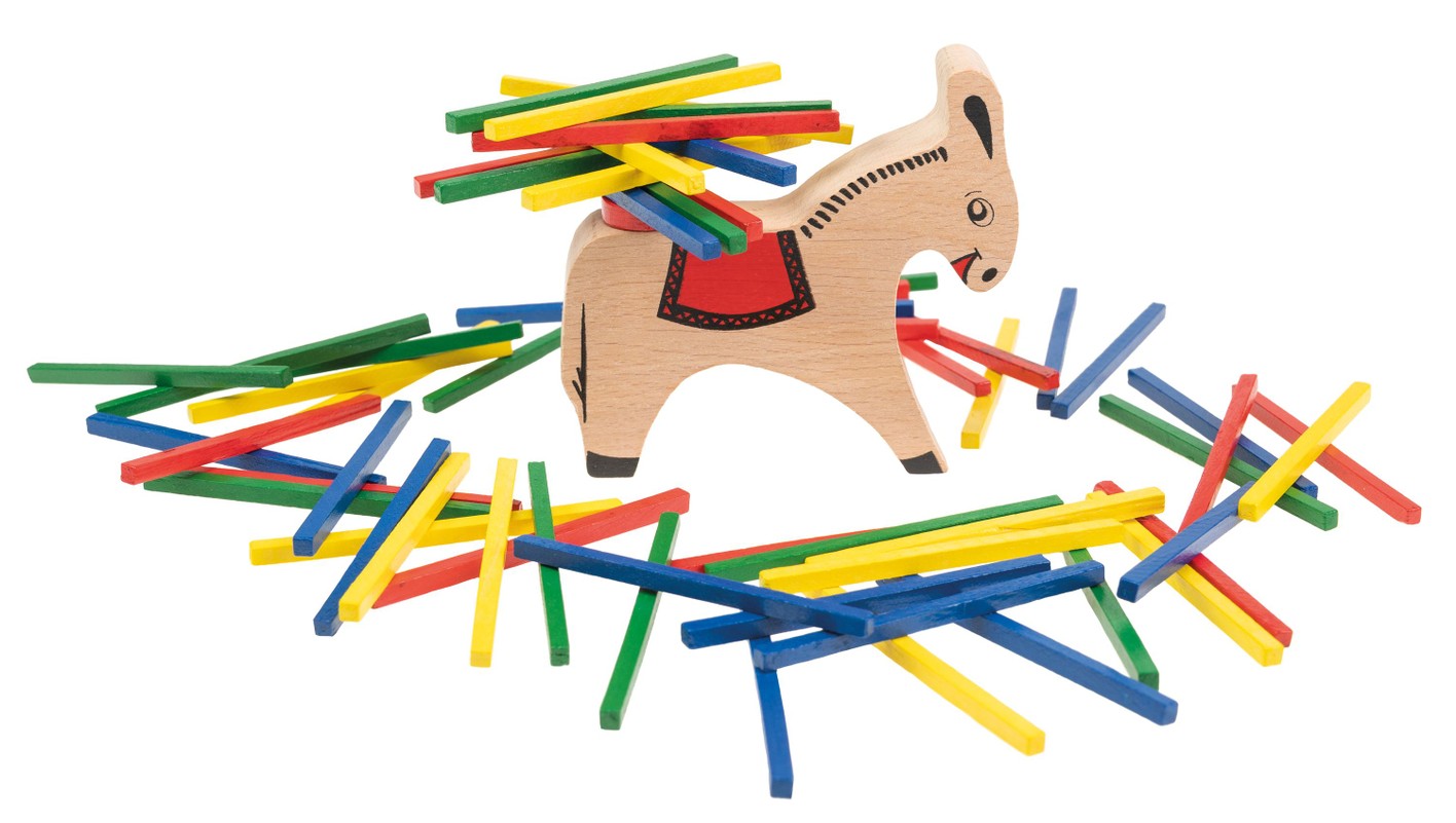 Līdzsvara spēle bērniem un pieaugušajiem. Uzziniet, cik augstu varat sakraut kociņus uz ēzelīša, pirms viņa krava nokritīs. No 1 līdz 4 spēlētājiem. Spēle ir iepakota prezentācijas iepakojumā un ir izgatavota no masīvkoka.