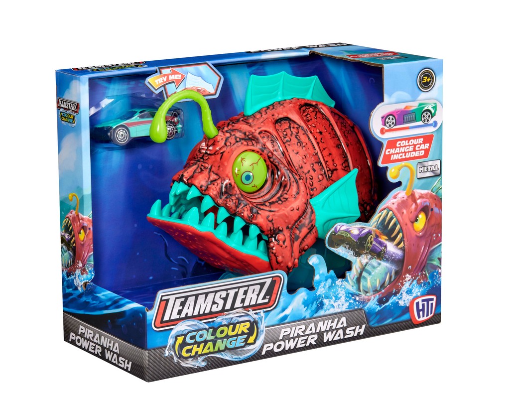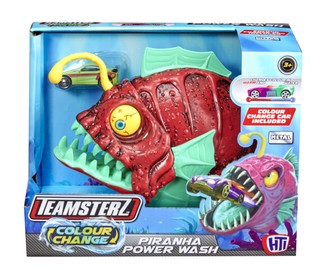 "Teamsterz Colour Change Piranha" rotaļu komplekts notver braucošu automobili, iegremdē to zem ūdens un pēc tam palaiž to vaļā citā krāsā! Katrā komplektā ir 1 ūdens kamera, kas maina krāsu. Krāsu maiņu automobiļiem aktivizē silts un ledaini auksts ūdens!