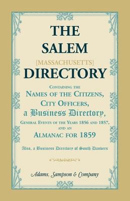 This is the ninth edition of the Salem Directory, with a business directory of South Danvers, Massachusetts. The general directory contains the names of 6,567 people listed in alphabetical order. Each entry gives the resident's name, occupation and address. 1,669 names were added to this edition and 1,232 names were struck out, making for an increase of 437 names. The Business Directory provides a list of approximately 165 professions and the names of the traders listed alphabetically along with their addresses. Following the Business Directory are sections describing the city government of Salem and those who held office at the municipal level, Justices of the Peace, Notaries Public, physicians, courts, taxation in Salem, post offices, congressional districts, railroads, military, schools and teachers, churches, clergymen, banks and insurance companies. The last part of this book contains a vast assortment of interesting advertisements divided into three sections: one for Boston, one for Salem and one for South Danvers. There is an index at the start of this section, which acts as a table of contents for the advertisements. The South Danvers Directory is located at the end of the book after all of the advertisements for Boston and Salem. It lists the town officers in 1858, the banks, churches, post office and then the business directory. Complete with a map of Salem, Massachusetts, from 1859 and a new surname index.