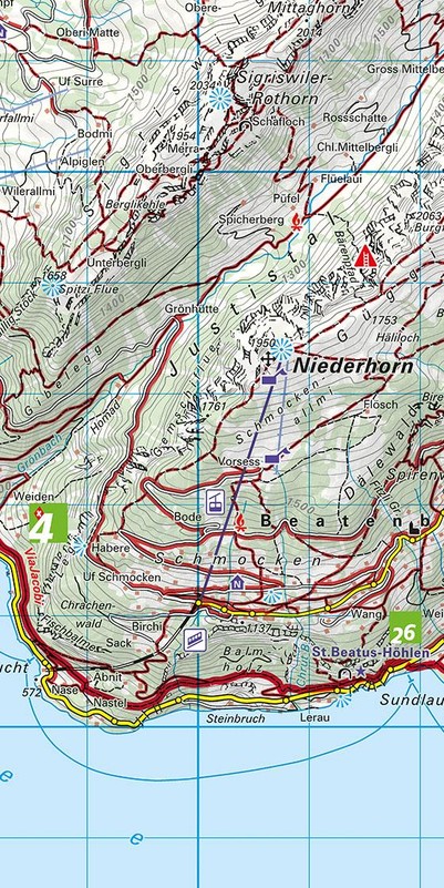 Mit nützlichen Informationen wie: Unterkunft und Verpflegung, Autobuslinien mit Haltestellen, Bergbahnen. GPS tauglich, 25 Meter Höhenkurven.