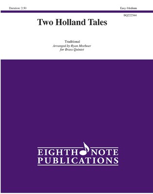 Inspired by two folk songs from the arranger's Dutch heritage---Two Holland Tales arranged by Ryan Meeboer for brass quintet---is a piece that combines both lyrical and upbeat sections. Daar waren twee koningskinderen" (There Were Two Royal Children) is the opening lyrical movement. The piece then moves into "Toen ik op Nederlands bergen stond" (I Once Stood On the Netherland's Hills). This is a fast movement in 6/8."