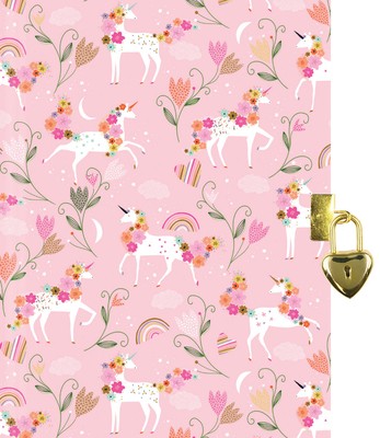 Unlock their imaginations and encourage their creativity with this adorable Unicorn Blooms Locking Journal!Young scribes can record their innermost thoughts and dreams within its pages, knowing that they're protected under lock and key.Journal comes with a sturdy lock and two keys.Smooth-finish, lightly lined 120 gsm pages support a variety of pens and pencils.Acid-free archival-quality paper preserves precious entries for future reflection.Frolicking unicorns, with flowery manes and tails, ado…