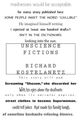 In Richard Kostelanetz's Unscience Fictions several narratives, each with its own typeface, are run over several successive pages in six continuous horizontal lines, with new narratives taking the place of previous ones whose length has expired, all in a continuing contribution to the nexus of avant-garde fiction and book-art.