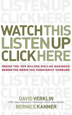 The TV program coming into our living rooms isn't free. It's a simple Faustian bargain consumers have made but one with enormous implications. It means that David Verklin, CEO of one of the world's largest ad-buying companies, and his clients-the world's largest advertisers-control what TV programs get aired, what magazines get published, and how Google and Yahoo stay in (very healthy) business. In Watch This, Listen Up, Click Here, Verklin and Kanner expose the inner workings of the media, marketing, and advertising industries. Readers will learn why their favorite shows get cancelled, why Oprah gives away cars, and how money, people, politics, and new technologies are transforming TV, the Internet, radio, magazines, and other media Americans consume every day.