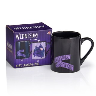 Ielejiet karstu dzērienu, kafiju, tēju vai karsto šokolādi, lai redzētu, kā šī Wednesday Addams krūze maina krāsu un atklāj Nevermore akadēmiju no populārā Netflix seriāla Wednesday.