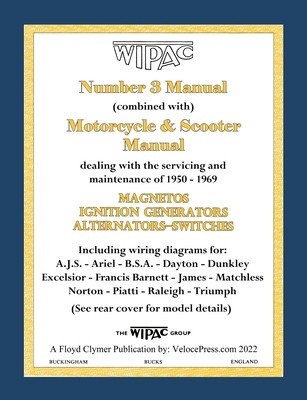 Wipac issued two ring-bound versions of this manual. The first was titled 'Number 3 Manual' and the second 'Motorcycle & Scooter Manual' but unfortunately, the publication dates of the individual pages were not identified. However, based on the contents, we can estimate that they were published in 1964 and 1969 approximately. The later manual contains considerably more information plus numerous updates to the data in the earlier manual. Unfortunately, some of the information from the earlier manual was also omitted from the later manual as it was probably considered to be outdated. However, as that outdated information is of significant interest to today's owners and restorers, we have combined the entire data from both manuals into a single publication. Please note, that wherever the earlier data had been updated, we have only included the latest update in order to prevent duplication of information. This 'combination' manual includes alternator and generator testing and servicing instructions, spare parts illustrations and part numbers plus Technical Data Sheets and Service Bulletins that provide additional information due to model updates and/or electronic equipment modifications. It also includes wiring diagrams by individual model type including: A.J.S., Ariel, B.S.A., Dayton, Dunkley, Excelsior, Francis-Barnett, James, Matchless, Norton, Piatti, Raleigh (mopeds) and Triumph. The entire content of this publication is devoted to the operation, testing, servicing, maintenance, overhaul and adjustment of all the major Wipac electrical components utilized by the various manufacturers listed above. Out-of-print and unavailable for many years, these manuals are extremely difficult to find on the secondary market and we are pleased to be able to offer this combined reproduction as a service to all owners, restorers and enthusiasts of 1950-1969 Wipac equipped motorcycles, scooters and mopeds. Wiring diagrams that are included - by manufacturer and model type: A.J.S. - Model 14, 14S, 14CS, 14CSR & Model 8.ARIEL - Colt & Pixie. B.S.A. - C10L, Bantam, Dandy, Sunbeam (Scooter) & Beagle.DAYTON - Flamenco Scooter & Albatross Scooter.DUNKLEY - Whippet (Scooterette).EXCELSIOR - Talisman.FRANCIS-BARNETT - Cruiser 80, Trials 83, Cruiser 84, Trials 85, Plover 86, Falcon 87, Model 88, Cruiser 89 & Cruiser 91.TrimJAMES - Commodore, Super Swift, Comet, Scooter, Flying Cadet, Captain, M.I5 & M.16.MATCHLESS - Model G2, G5, G2S, G2CS & G2CSR. NORTON - Jubilee, Navigator & Electra.PIATTI - Scooter.RALEIGH - Moped RM.8 & RM.9.TRIUMPH - T10 Scooter, T20 Super Cub, Tina Scooter &