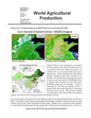 China's 2014/15 corn production is estimatedat 214.0 million tons, down 3.0 million tons or1.0 percent from last month and down 4.5million tons or 2.0 percent from last year'srecord crop. Area is estimated at 36.8 millionhectares, surpassing last year's record by 1.0percent. Area has shown a strong upward trendin recent years, particularly in Northeast China, as farmers have switched to corn from less profitable crops such as soybeans. Yield isestimated at 5.82 tons per hectare, down 1percent from last month and down 3.4 percentfrom last year's record. The revision is basedon information from crop models and satelliteimagery, and reports from local government and industry sources.A serious drought developed in July and August in parts of Northeast China and the North ChinaPlain. At its peak in late August, the drought affected approximately 5 million hectares of crops(mostly corn) in the critical reproductive/filling stage. Sharply lower yields have been reportedin some of the drought-impacted areas, particularly in Henan and Liaoning provinces