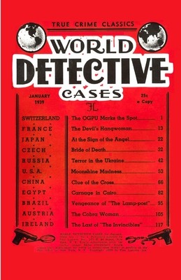 A replica of the first issue, January 1939, of WORLD DETECTIVE CASES digest magazine featuring THE OGPU MARKS THE SPOT by Rene Benoit, THE DEVIL'S HANGWOMAN by Antoinette Chabert, AT THE SIGN OF THE ANGEL by Wilfred Fang Chao, BRIDE OF DEATH by Michael Jurbala, TERROR IN THE UKRAINE by Ivan Petrienov, MOONSHINE MADNESS by Leon Andrews, CLUE OF THE CROSS by Wallace King, CARNAGE IN CAIRO by Albert Mizrahi, VENGEANCE OF "THE LAMP-POST" by James Cunha, THE COBRA WOMAN by M. N. Lamarr, and THE LAST OF "THE INVINCIBLES" by Paul Allenby.