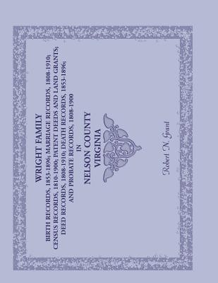 The author has amassed a bounty of information about Wrights in southern Virginia. This volume is a collection of Wright records from Nelson County, Virginia. This work is divided into the following sections: Birth Records, 1853-1896; Marriage Records, 1808-1910; Census Records, 1810-1900; Patent Deeds and Land Grants; Deed Records, 1808-1910; Death Records, 1853-1896; and Probate Records, 1808-1900. Each section contains source information and an index. Sources include official county records in the Library of Virginia in Richmond. A most helpful feature for each entry is the "identification" column, in which the author identifies the specific family and Wright ancestors from whom the named Wright descends.