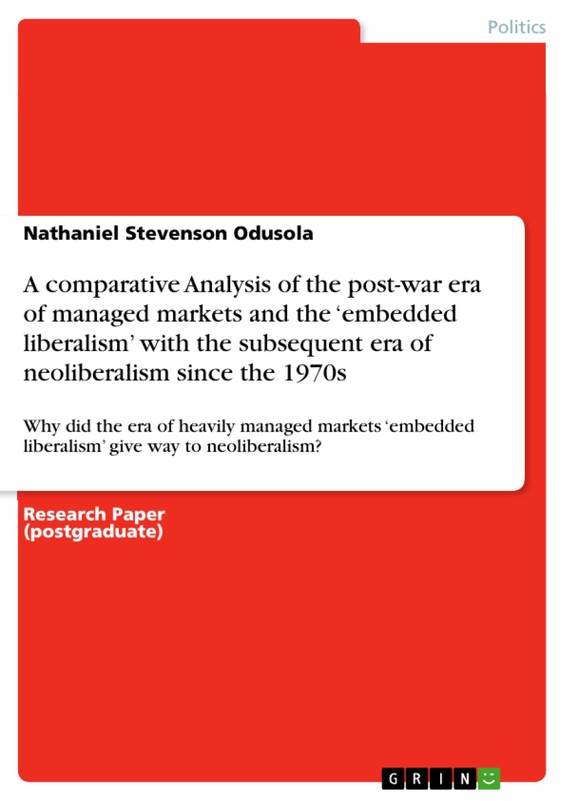 Research Paper (postgraduate) from the year 2019 in the subject Politics - International Politics - Topic: Globalization, Political Economics, grade: 100, , course: Political Economics, language: English, abstract: This article made comparison between 'embedded liberalism' and 'neoliberalism'. The article also traced the basis for the shift from 'embedded liberalism' to the emergence of 'neoliberalism'. In order for the government to intervene in economic policies matters; democracy was the driving force for the spread of embedded liberalism. Macroeconomics was introduced by the government of advanced economies to address three critical areas of the economic policies, namely: inflation, market output, and unemployment. The other aspect of this period was to win the cold war and to empower the United States as the global hegemon. The departure from embedded liberalism to neoliberalism in 1971 was due to domestic economic pressure of the US. President Nixon's administration ended the 'convertibility of the dollar into gold' policy regime. The government had to float the dollar in the international market allowing market forces to determine the value of the dollar currency. The administration of Reagan and Thatcher institutionalised 'neoliberalism' as an alternative to 'embedded liberalism'. The adoption of 'neoliberalism' led both administrations to implement monetary policies which led to stripping labour from further threatening the economies of the United States and the United Kingdom with inflation. The overall implications were increased profits for capitalists or entrepreneurs as against employees of the labour market. The analysis revealed that there was an increased unemployment rate due to high-interest rates and deliberate policies to encourage recession in order to forestall inflation.