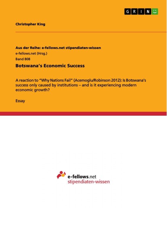 Essay from the year 2013 in the subject Politics - International Politics - Topic: Globalization, Political Economics, grade: 1,0, Indiana University (Department of Political Science), course: Politics of International Development, language: English, abstract: Botswana is a landlocked country in southern Africa with a population of about 2 million people. It used to be one of the poorest countries in Africa, but after it gained independence from the United Kingdom in 1966, it went on a transformation to a middle-income country with a per capita GDP of $16,800 in 2012 (cf. Central Intelligence Agency 2013). Today, Botswana is a multi-ethnic and multi-party representative democracy with "inclusive institutions" and the least corrupt country in Sub-Saharan Africa (cf. Transparency International 2012). It is ranked by Freedom House as "Free" and has a very high HIV rate of 24.8%. Botswana has been framed as an exceptional economic success story in Africa and the following essay will explore whether institutions are the only cause of Botswana's economic success and if Botswana is experiencing modern economic growth.