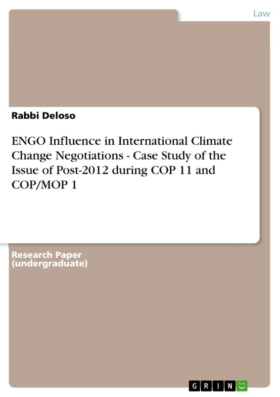 This study aims to bring the debate on NGO influence to the current stage of international climate change negotiations. This thesis shall explore the influence of key ENGO's within the legal framework of participation in climate change policymaking with particular focus on the issue of process for negotiation of post-2012 climate policy during the Eleventh Conference of the Parties to the UNFCCC and first Conference of the Parties serving as the Meeting of Parties to the Kyoto Protocol (COP11 and COP/MOP1) as well as the events leading to and following the said meeting, as may be relevant.