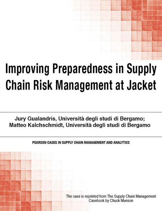 This new case study examines risk management at Jacket, where supplier delays and quality problems refocused executive management on the issue of reducing supply vulnerabilities. It reviews Jacket's fluid and gas control products and its fragmented markets, where business uncertainty and complexity are growing. Next, it compares potential strategies, drawing on other companies' experiences to identify both strengths and drawbacks. Focusing on realistic issues throughout, this case study offers exceptional value to both students and practitioners. Authors: Jury Gualandris and Matteo Kalchschmidt; both from Università degli studi di Bergamo.
