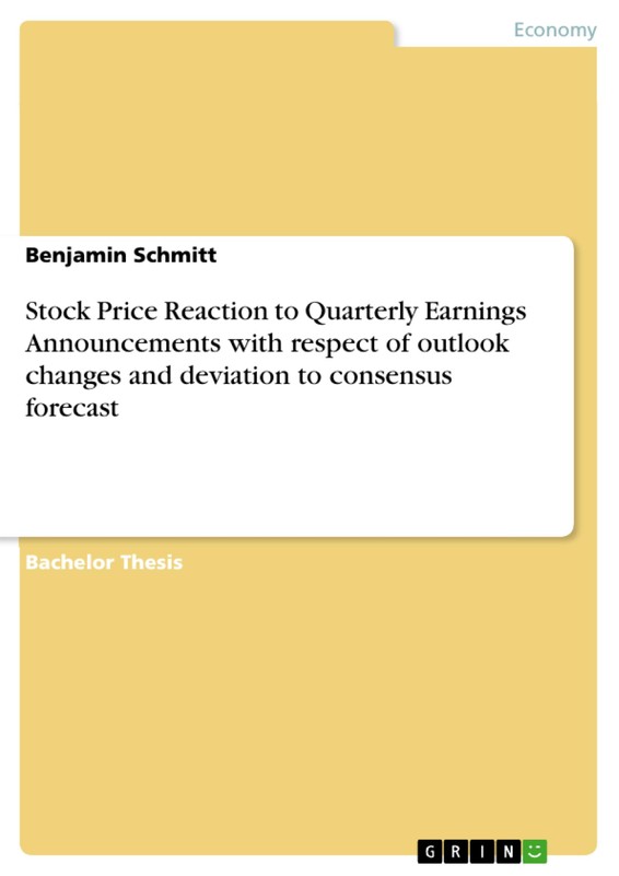 Bachelor Thesis from the year 2008 in the subject Business economics - Investment and Finance, grade: 1.1, EBS European Business School gGmbH (Finance), language: English, abstract: Many authors have already studied about stock price reactions after earnings announcements yet, which is because of the importance of earnings announcements, in particular quarterly earnings announcements, for many investors. However, all major studies concerning this topic deal with long-term scenarios, the stock's price performance is measured for a time period of at least three quarters. Due to the fact that there are many investors, especially institutional investors such as hedge funds that trade stocks much more frequently, the existing studies are not relevant for them. This paper studies stock price reactions around quarterly earnings announcements for companies listed in Deutscher Aktienindex (DAX) or Midcap DAX (MDAX) with respect to changes of the company's full-year outlook and of earnings surprise regarding analyst consensus forecast within ten days before and after the announcement date. Hence, this paper aims to analyse short-term reaction to quarterly earnings announcements, which are of relevance for all investors, whose investment strategy is, at least partially, focussing on the short-term performance. The main target group of this analysis are therefore hedge funds and investors that run short-term strategies. Due to the fact that the widespread Event Study Methodology is focused on the long-term, it is irrelevant for this analysis.